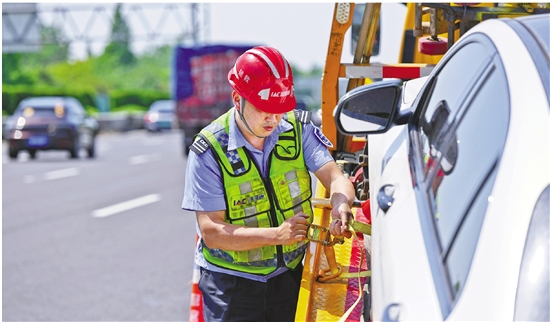 绍兴管理中心施救员用绑带固定故障车辆轮胎 骆加春 摄