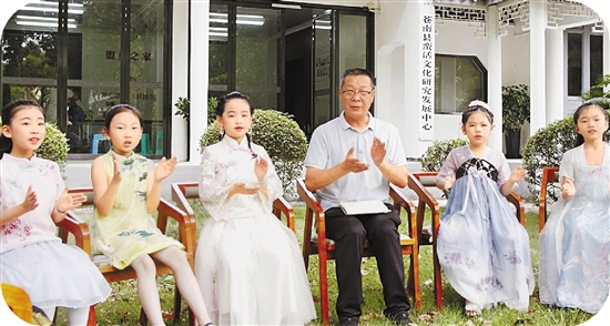 《蛮话童谣》编著者王斌教小朋友们学习蛮话童谣。 受访者供图
