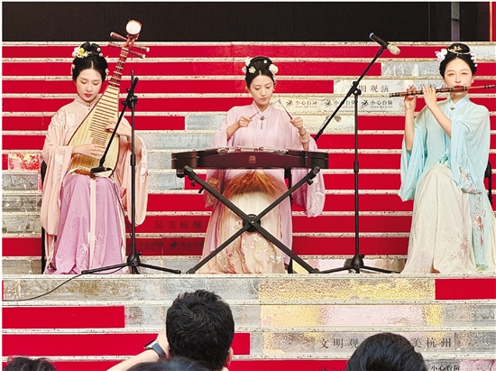杭州市演艺业协会怡枫国乐团在杭州东坡大剧院前演出。 受访者供图