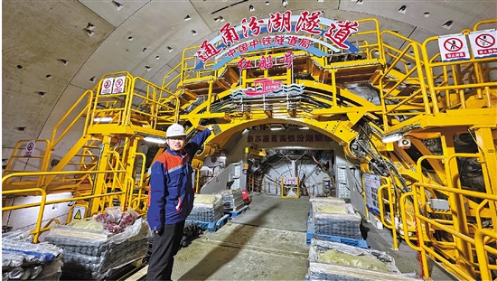 花楠介绍“红船号”盾构机。 本报记者 顾雨婷 摄