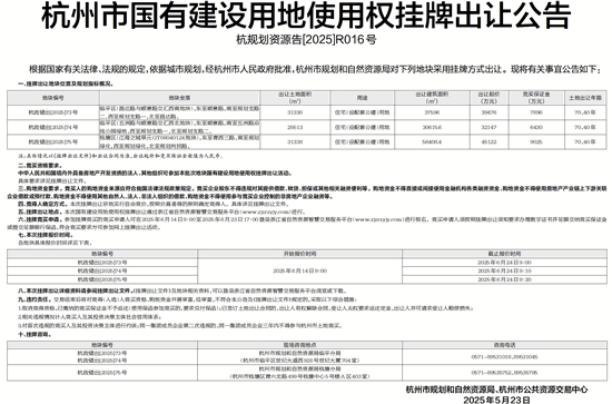 六、挂牌竞买申请。参加挂牌竞买的竞买申请人可在2025年6月14日9∶00至2025年6月23日17∶00登录浙江省自然资源智慧交易服务平台(www.zjzrzyjy.com)进行报名。竞买申请人须按照挂牌出让须知要求办理数字证书并足额交纳竞买保证金或提交足额银行保函,符合竞买要求方可参加网上挂牌出让活动。