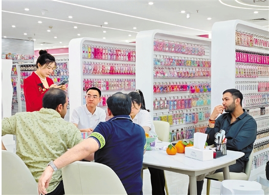 孙敏(红衣女子)正与外国客商洽谈合作。 受访者供图