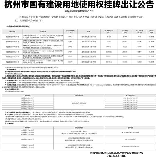 六、挂牌竞买申请。参加挂牌竞买的竞买申请人可在2025年6月17日9∶00至2025年6月26日17∶00登录浙江省自然资源智慧交易服务平台(www.zjzrzyjy.com)进行报名。竞买申请人须按照挂牌出让须知要求办理数字证书并足额交纳竞买保证金或提交足额银行保函,符合竞买要求方可参加网上挂牌出让活动。