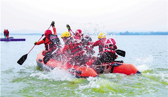 | 5月28日,长三角区域水域应急救援技能比武在长兴县泗安镇举行,来自江苏宜兴、浙江安吉、安徽广德等地的社会化救援队伍参加了翻舟自救、绕桩攻击式活饵救援、200米竞速绕标赛3个项目的技能大比武,在实战中强化防汛应急处置能力和抢险救灾能力,完善跨省域基层应急联动。 通讯员 谭云俸 李金俊 摄 |