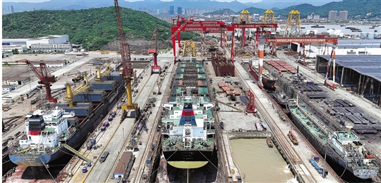 5月14日,舟山市普陀区小干岛上的船舶维修企业船坞内一派繁忙景象。 视觉中国供图