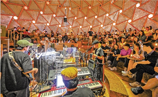 杭州运河边小河公园里的“大油罐”最近火了,其中2号油罐被改造成一处Livehouse(小型演出场所),油罐顶部改造成了透明玻璃,顾客可一边欣赏夜空,一边聆听音乐,独特的体验吸引了众多年轻人前来打卡。杭州小河公园的前身是小河油库,如今,这些曾见证工业历史的油罐,正以文艺新地标的身份焕发新生。 本报记者 董旭明 摄 |