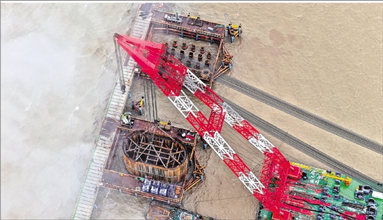 | 6月10日,杭州湾海域细雨绵绵,通苏嘉甬高铁杭州湾跨海铁路大桥建设火热不减。目前,海中引桥钢管桩施工已近尾声,未来通车后,宁波前湾新区将进入“双桥时代”。 通讯员 虞昌胜 张滔 本报记者 贺元凯 摄 |