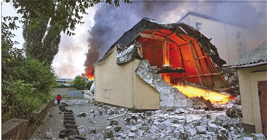 当地时间6月10日,乌克兰基辅,俄罗斯导弹和无人机袭击后,受损建筑上空浓烟滚滚。