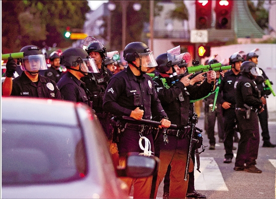 6月10日,在洛杉矶市中心,警察在宵禁生效后试图驱散街上的人群。