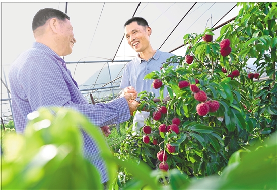 李发勇(右)在苍南大棚里指导荔枝种植。 本报记者 徐彦 摄