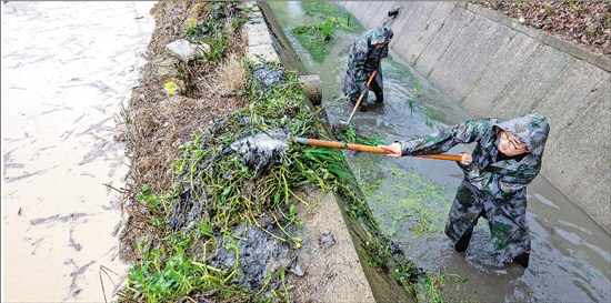 6月11日,长兴县小浦镇中山村,青年党员在清理农田排水沟内的水草杂物,加速积水排放。 通讯员 谭云俸 摄