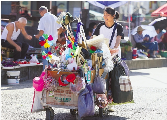 陈慧推车去梁弄菜场摆摊。 本报记者 王建龙 摄