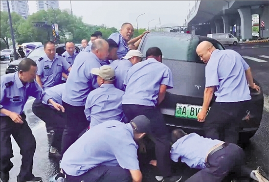 杭州公交司机齐力抬车救助受困外卖小哥。 杭州公交供图