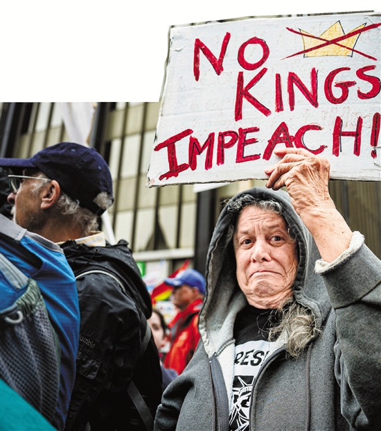 6月14日,在美国波士顿,人们参加“不要国王”抗议活动。 新华社发(朱子于 摄)