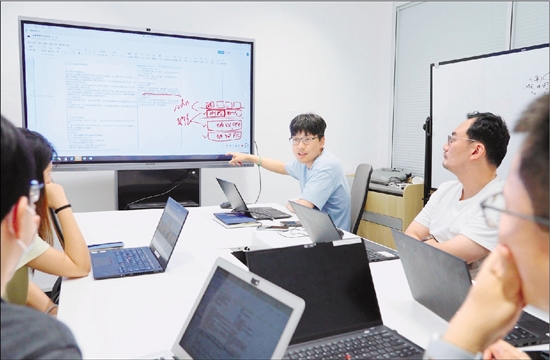 宫禄奇(右三)与团队成员讨论技术问题。 之江实验室供图