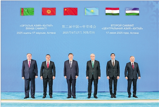 当地时间6月17日下午,第二届中国—中亚峰会在阿斯塔纳独立宫举行。这是习近平同中亚五国元首集体合影。
