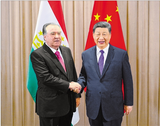 当地时间6月17日上午,国家主席习近平在阿斯塔纳出席第二届中国—中亚峰会期间会见塔吉克斯坦总统拉赫蒙。 新华社记者 李涛 摄