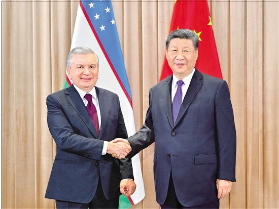 当地时间6月17日上午,国家主席习近平在阿斯塔纳出席第二届中国—中亚峰会期间会见乌兹别克斯坦总统米尔济约耶夫。 新华社记者 翟健岚 摄