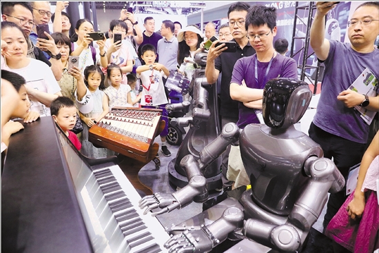 6月20日至22日,国内首个人形全产业链专业展——2025杭州国际人形机器人与机器人技术展览会在杭州大会展中心开幕。本次展览会吸引了宇树、云深处、特斯拉等知名企业及核心零部件供应商参展,集中展示仿生驱动、具身智能、脑机接口等先进技术及应用场景。图为机器人演奏钢琴吸引了大量观众。 通讯员 徐军勇 摄 |