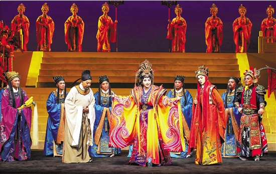 陈美兰(前中)主演《宫锦袍》工作照。 浙婺供图