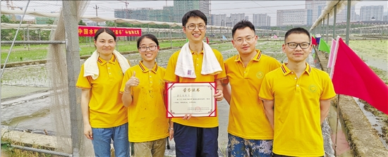 王克剑(中间)带团队参加插秧比赛。 受访者供图