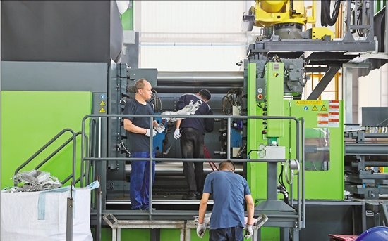 兰溪镁合金半固态压铸中试基地,作业人员正在进行镁合金产品的半固态注射成型生产。 共享联盟·兰溪 范湃青 摄