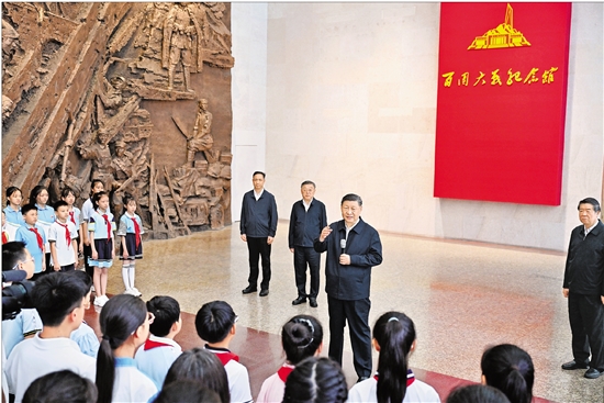 | 7月7日至8日,中共中央总书记、国家主席、中央军委主席习近平在山西考察。这是7日下午,习近平在位于阳泉市狮脑山的百团大战纪念馆考察时,同前来参观的青少年学生和纪念馆工作人员亲切交流。 新华社记者 殷博古 摄 |