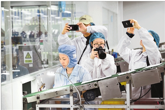 | 7月7日至8日,由浙江省新闻工作者协会、湖州市新闻工作者协会联合主办,浙江省记协新闻摄影工委等承办的“两山”理念20周年采访活动及新闻摄影研讨会,在湖州市吴兴区举行。60余家主流媒体的摄影记者齐聚南太湖畔,将镜头对准这片践行绿色发展理念的热土。图为采访活动中,媒体记者走进吴兴区的企业车间,用镜头定格绿色工业转型的科技魅力。 本报记者 倪雁强 共享联盟·湖州 项飞 吴拯 摄 |