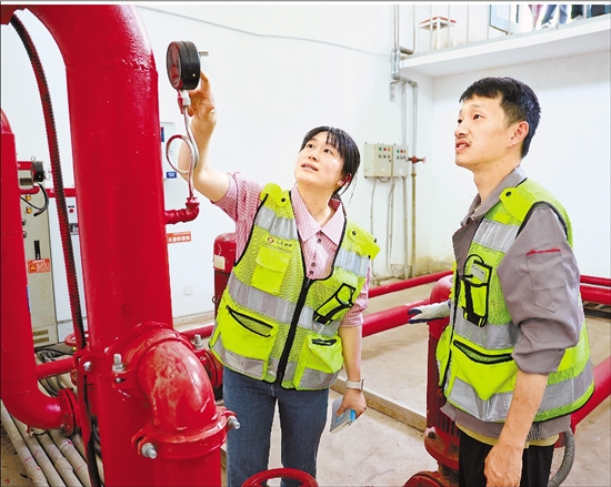 邓锋带着记者(左)巡查水泵房。 共享联盟·永康 卢斌 摄
