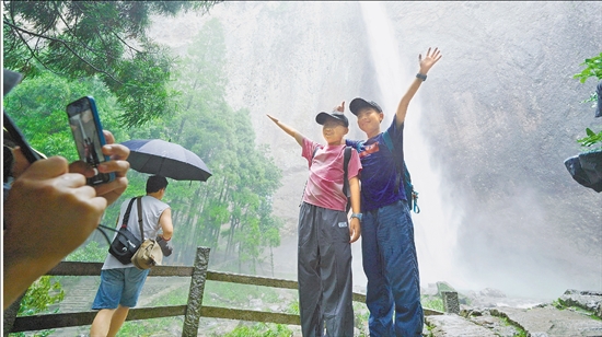 7月9日,大雨过后,雁荡山景区的大龙湫瀑布显出磅礴的气势,吸引游客打卡。