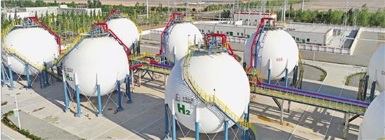 中国石化新疆库车绿氢示范项目制氢厂储氢罐区(资料照片)。2023年6月30日,新疆库车绿氢示范项目顺利产氢,这是我国首个万吨级光伏制氢项目。 新华社发