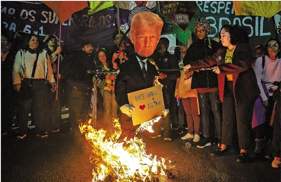 当地时间7月10日,巴西民众在圣保罗的保利斯塔大道举行示威活动,抗议美国总统特朗普宣布对巴西征收关税。在集会中,示威者焚烧了特朗普的肖像。 CFP供图