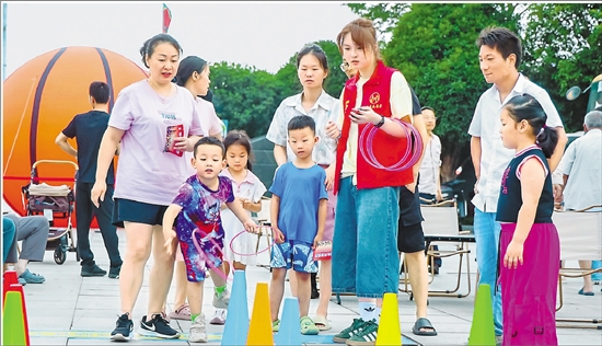 7月12日晚,“浙BA”嘉兴赛区预选赛开打,球馆边的“嘉有共富集市”上,小球迷参与互动游戏。 赛事主办方供图