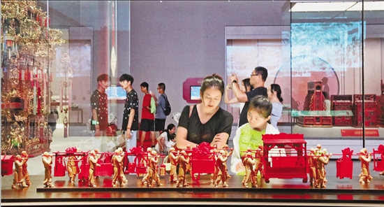 | 为丰富市民暑期文化生活,提升参观体验,浙江省之江馆区自7月1日起至8月31日,正式推出“预约入馆+双休夜间开放”服务,让博物馆成为市民夏夜纳凉、感受文化魅力的好去处。图为7月13日傍晚,不少市民游客在之江馆区内欣赏文物。 本报记者 栾兰 摄 |
