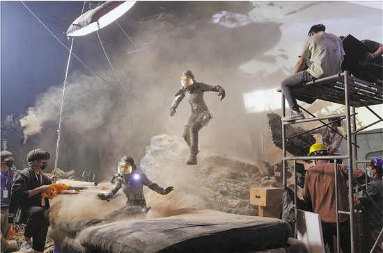 科幻短片《诞辰》中沙尘暴场景在博采AI虚拟影视基地的拍摄现场。 受访者供图