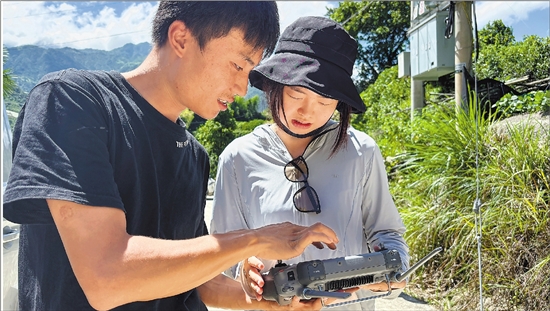 飞手彭毅(左)教记者(右)调节无人机作业参数。 拍友 夏文浩 摄