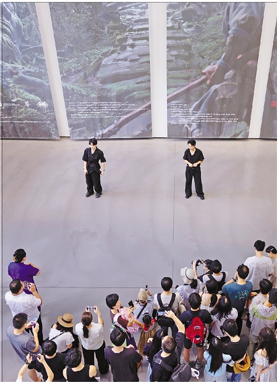 7月25日,观众在“黑神话:悟空”主题艺术展上欣赏游戏角色模型雕塑和游戏歌曲现场演唱。 本报记者 倪雁强 摄