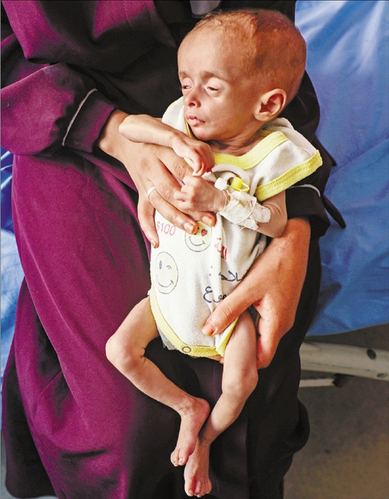 图为7月23日在加沙城一所医院里拍摄的营养不良的儿童。 新华社发
