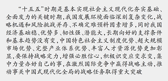“十五五”时期是基本实现社会主义现代化夯实基础、全面发力的关键时期,我国发展环境面临深刻复杂变化,战略机遇和风险挑战并存、不确定难预料因素增多,同时我国经济基础稳、优势多、韧性强、潜能大,长期向好的支撑条件和基本趋势没有变,中国特色社会主义制度优势、超大规模市场优势、完整产业体系优势、丰富人才资源优势更加彰显,要保持战略定力,增强必胜信心,积极识变应变求变,集中力量办好自己的事,在激烈国际竞争中赢得战略主动,推动事关中国式现代化全局的战略任务取得重大突破