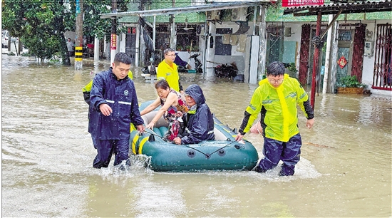 汶溪村村干部转移被困群众。 共享联盟·镇海 陈莹 摄