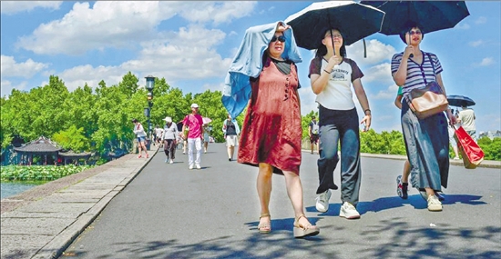 近日,杭州开启连续高温模式。图为游客顶着烈日游西湖。 本报记者 董旭明 摄