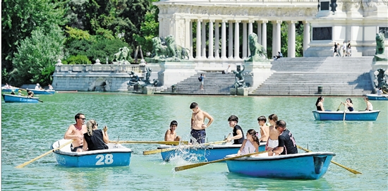 近日,西班牙国家气象局发布特别提醒,全境大部分地区受到热浪影响,西南部地区最高气温预计突破42摄氏度。图为人们在西班牙马德里的丽池公园划船。 新华社发