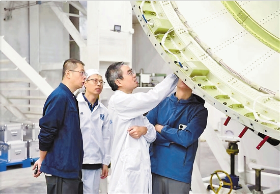 毛承元(左三)在技术区厂房带领分系统设计师研讨改进措施。 受访者供图