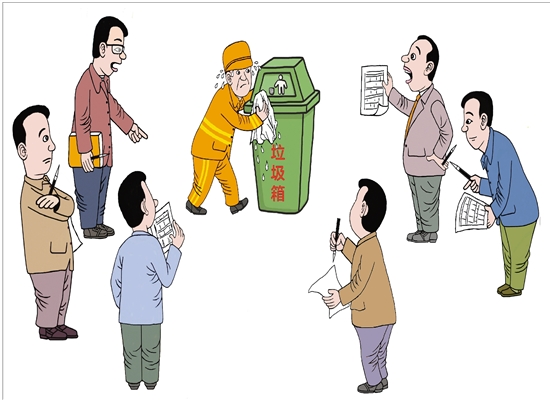据法治日报报道,近日,河北石家庄德明古镇景区内,环卫工人埋头擦拭垃圾桶,周围站着多名手持考核表的管理人员,形成鲜明对比,引发争议。垃圾桶干不干净,只要看效果就行,何需“一人干、多人看”式的围观考核?