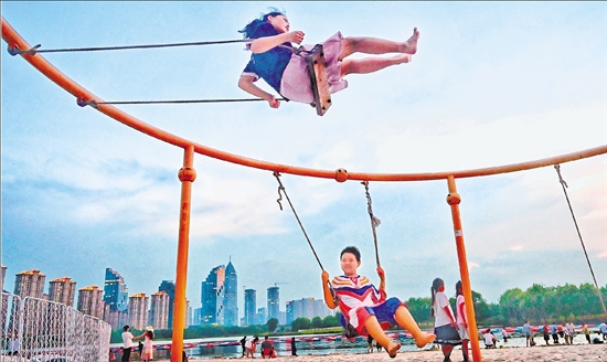 8月20日傍晚,绍兴迪荡湖畔的人工沙滩,孩子们在这里挖沙、荡秋千、驾驶履带车,欢声笑语不绝于耳。据了解,此处已成为绍兴市民夏夜消暑休闲的网红打卡地,日均客流量上万人次。 本报记者 董旭明 摄