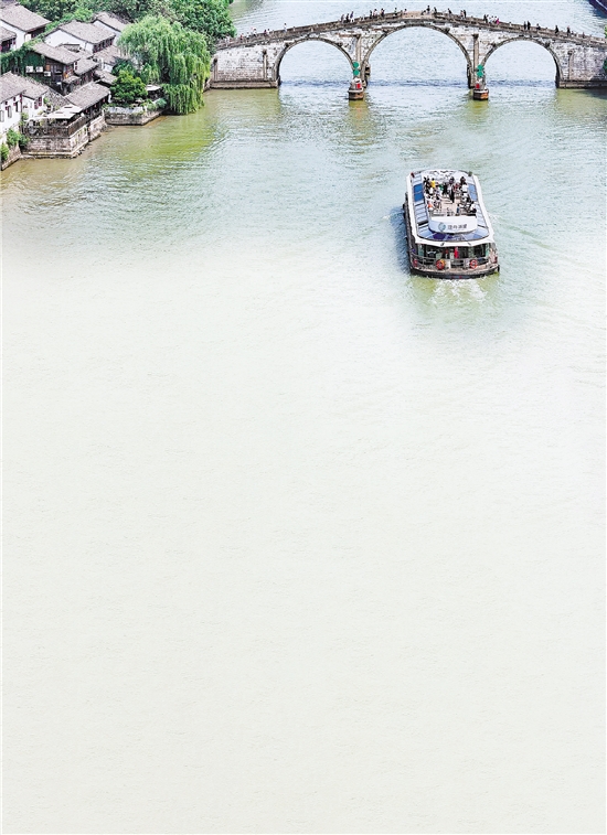 京杭大运河杭湖游线上,“馥桂汉宫”号游船途经杭州拱宸桥。