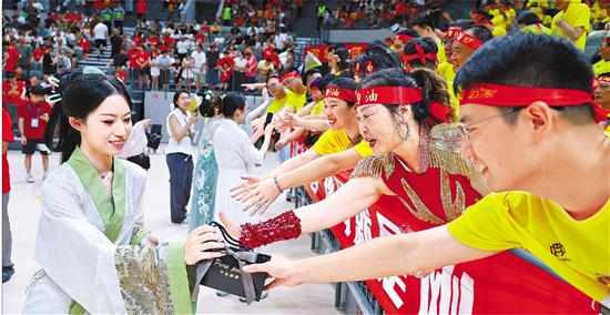中场休息时,“西施小姐姐”为金华队球迷送上珍珠礼物。 共享联盟·诸暨 周志豪 摄