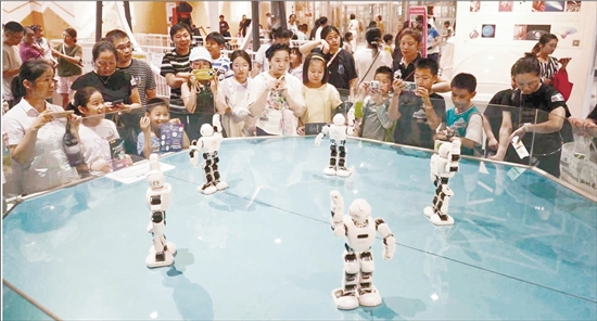 活动中,机器人表演吸引了许多市民围观。 阮帅 摄