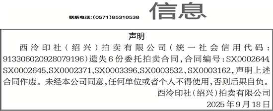 西泠印社(绍兴)拍卖有限公司(统一社会信用代码:913306020928079196)遗失6份委托拍卖合同,合同编号:SX0002644、SX0002645、SX0002371、SX0003396、SX0003532、SX0003162,声明上述合同作废。未经本公司同意,任何单位或者个人不得使用,否则后果自负。