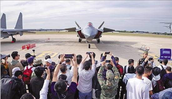 | 歼-20静态首秀、轰炸机编队通场、飞行表演队超绝亮相……9月19日上午,吉林长春,2025空军航空开放活动和长春航空展正式启幕。本届活动以“追梦空天、制胜未来”为主题,以精彩的飞行表演、新颖的装备展示、特色的主题展区和丰富的互动体验,全面立体展现空军的历史文化、建设成就和未来发展。图为首次歼-20地面静态展示,吸引很多观展群众的关注。 本报记者 倪雁强 摄 |